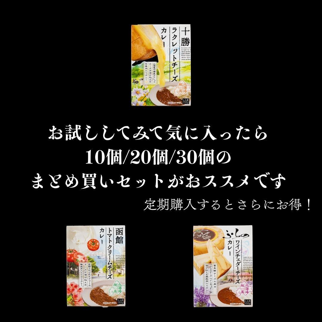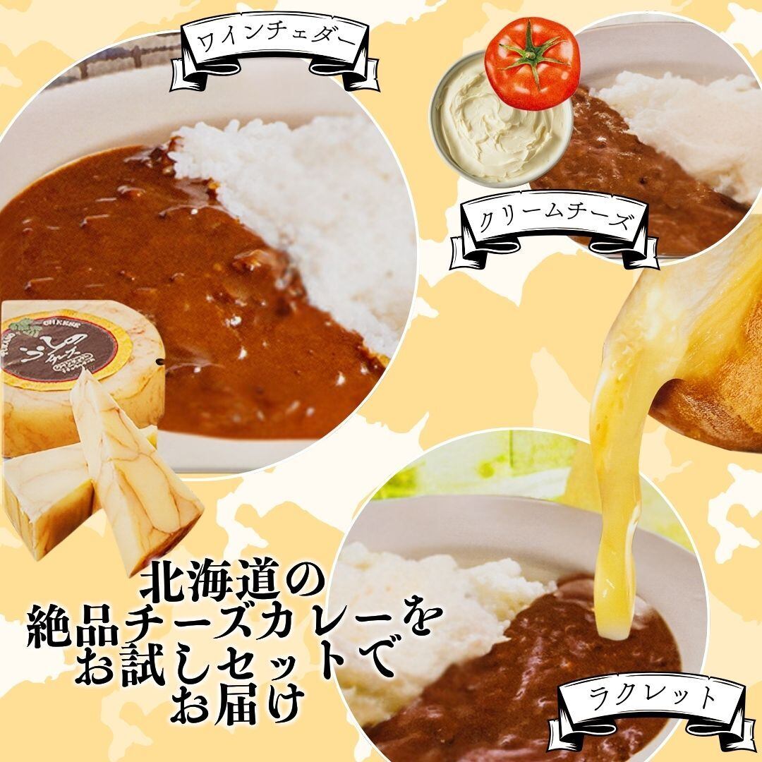 北海道各地ならではのチーズや食品をつかった挽肉カレーを1種類ずつお試しできるお得なカレーセット。ご当地チーズを使ったチーズカレー3種をお届けします。